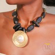 Ce collier imposant s’inspire des ornements traditionnels africains, où les perles massives et les pendentifs symbolisent la force, l’identité et la noblesse. Son grand médaillon doré martelé, orné d’une perle centrale, incarne l’élégance et la puissance des parures cérémonielles.