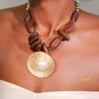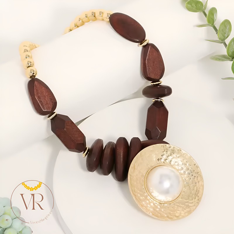 Conçu en perles en résine effet bois, alliage doré martelé et perle centrale nacrée, ce collier marie authenticité et raffinement moderne.