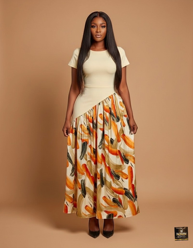A sophisticated and modern maxi dress with a fitted, short-sleeved bodice and a voluminous, printed skirt. The design features a bold, asymmetrical colour-block construction where the cream top panel meets the patterned skirt in a sharp, diagonal line, creating an incredibly flattering and waist-cinching effect. Perfect for formal occasions, weddings, gallery openings, or upscale business events.