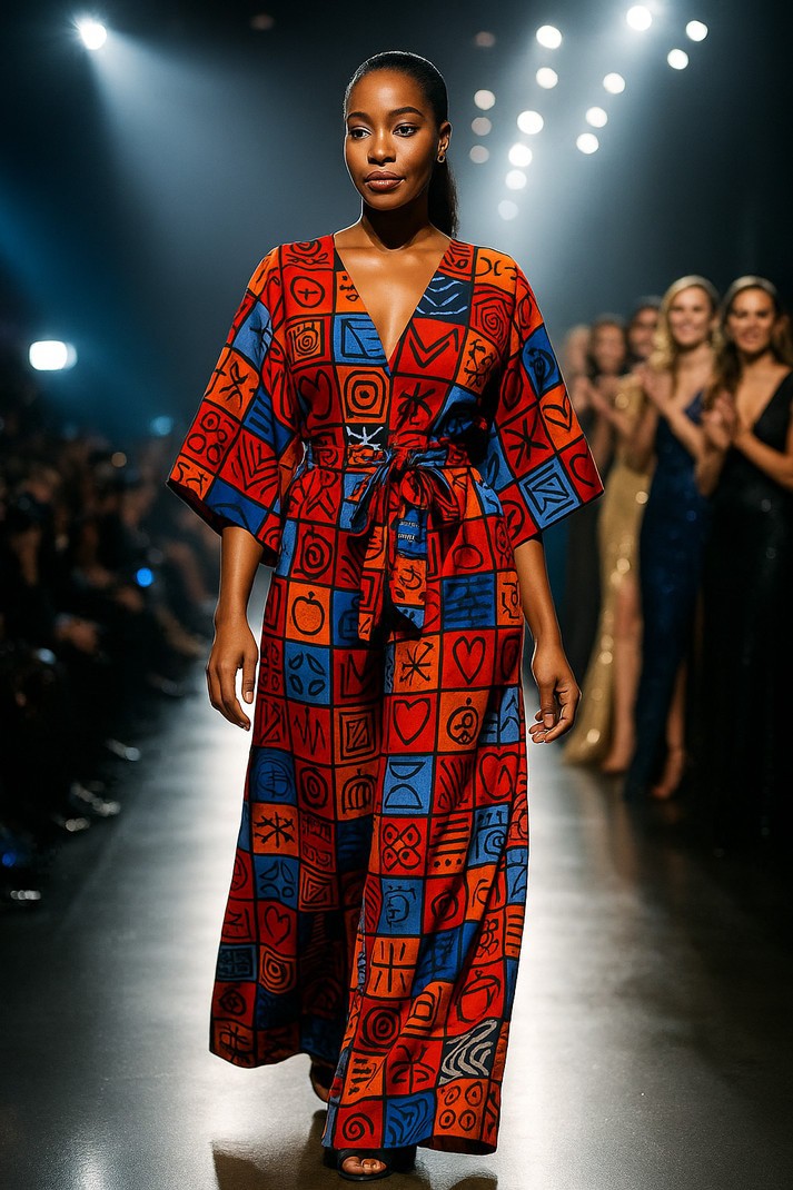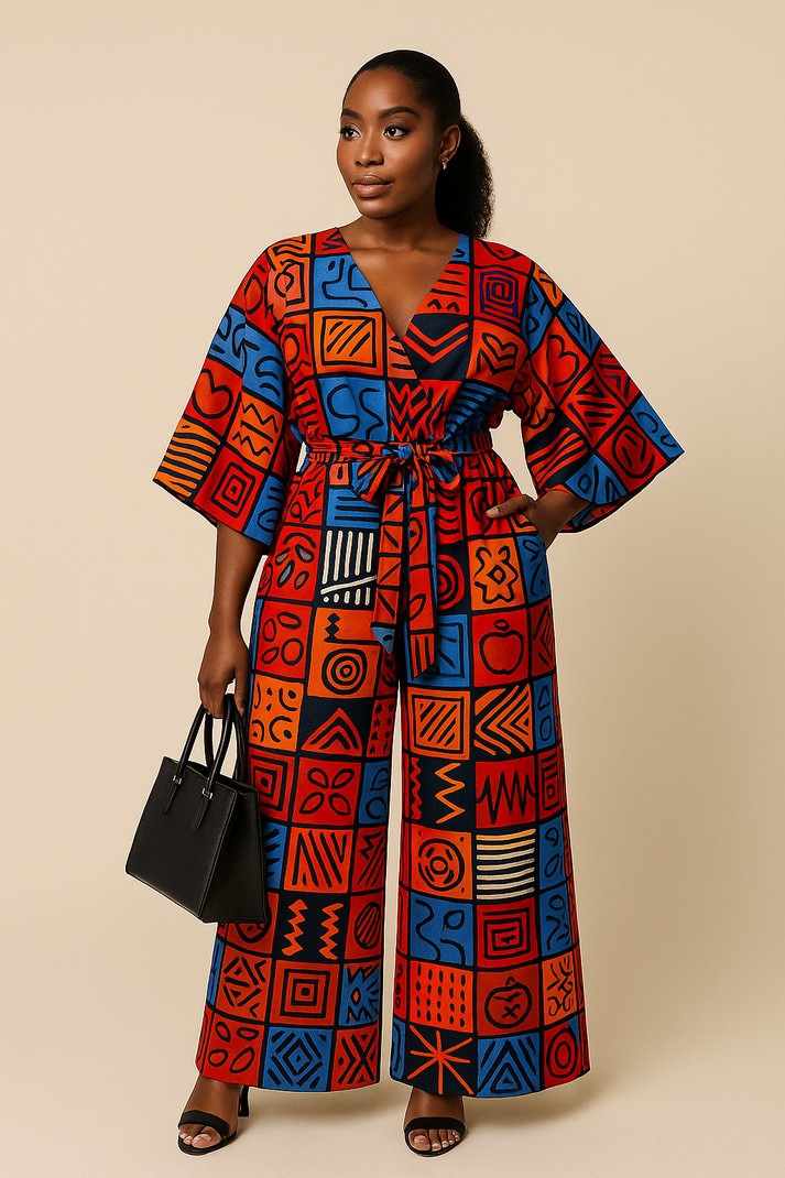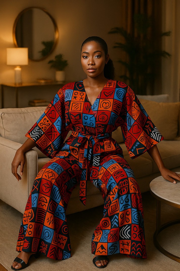 Sublimez votre style avec cette combinaison kimono longue confectionnée dans un tissu wax aux couleurs vibrantes. Son imprimé géométrique rouge, bleu et orange, inspiré de symboles africains, apporte une touche culturelle et contemporaine à votre garde-robe.