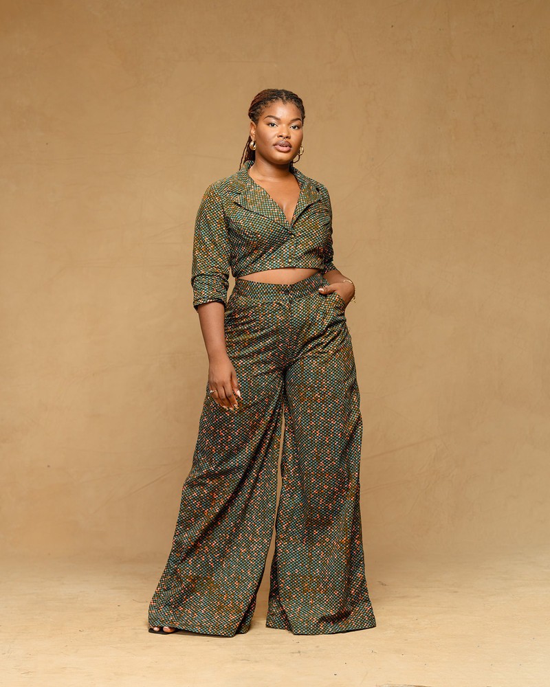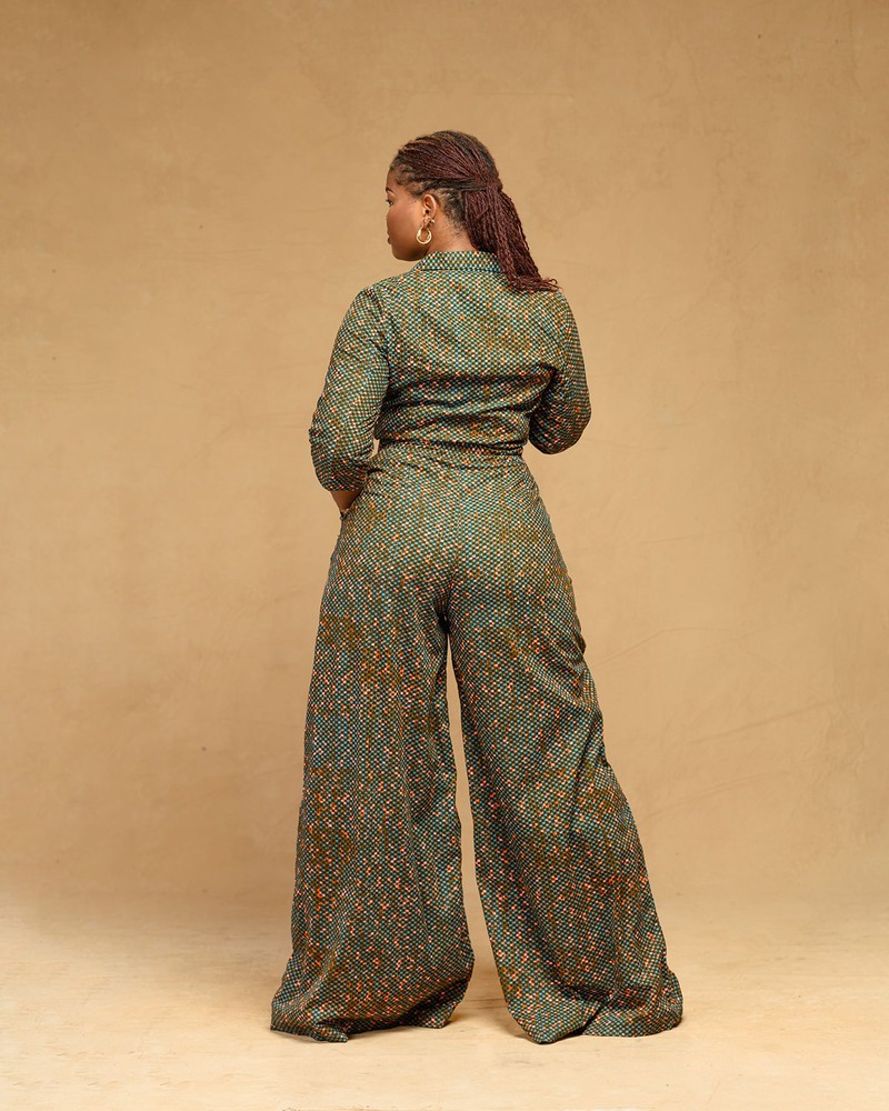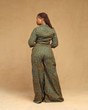 Combinaison top en veste croisé ouvert dans le ventre avec un pantalon légèrement évasé.