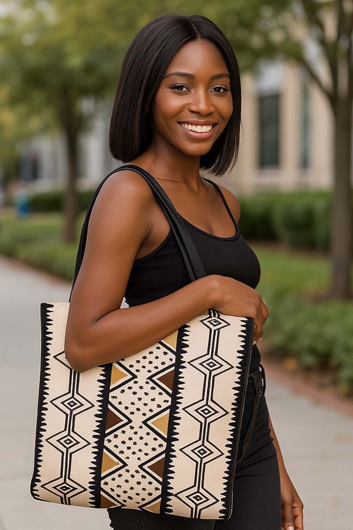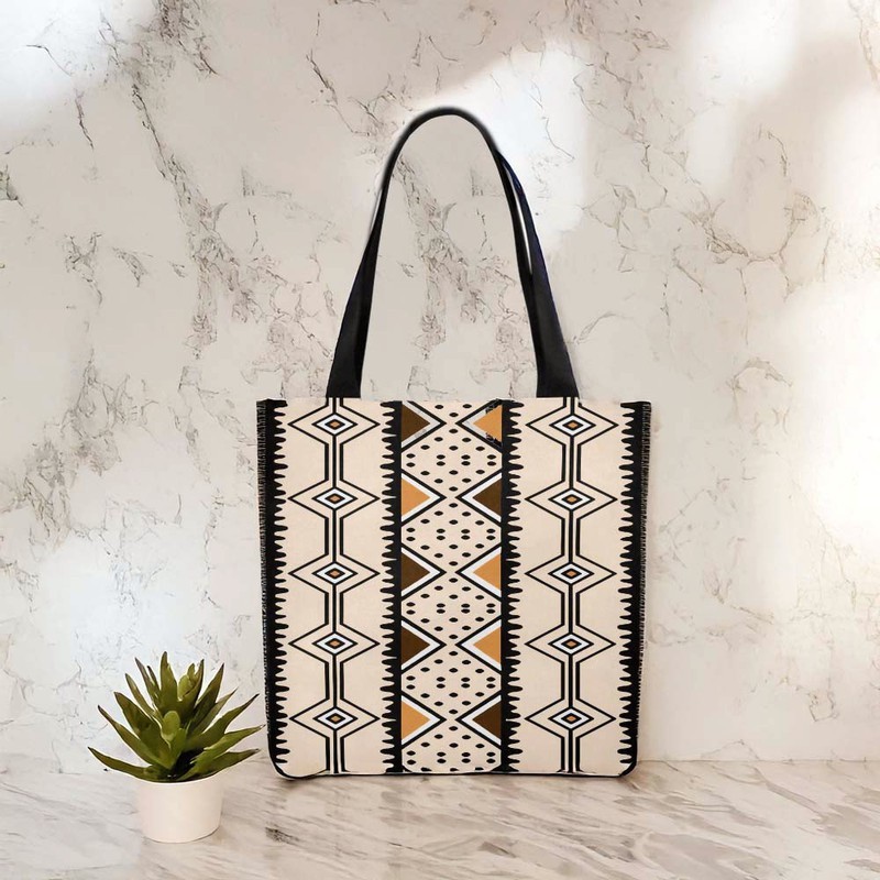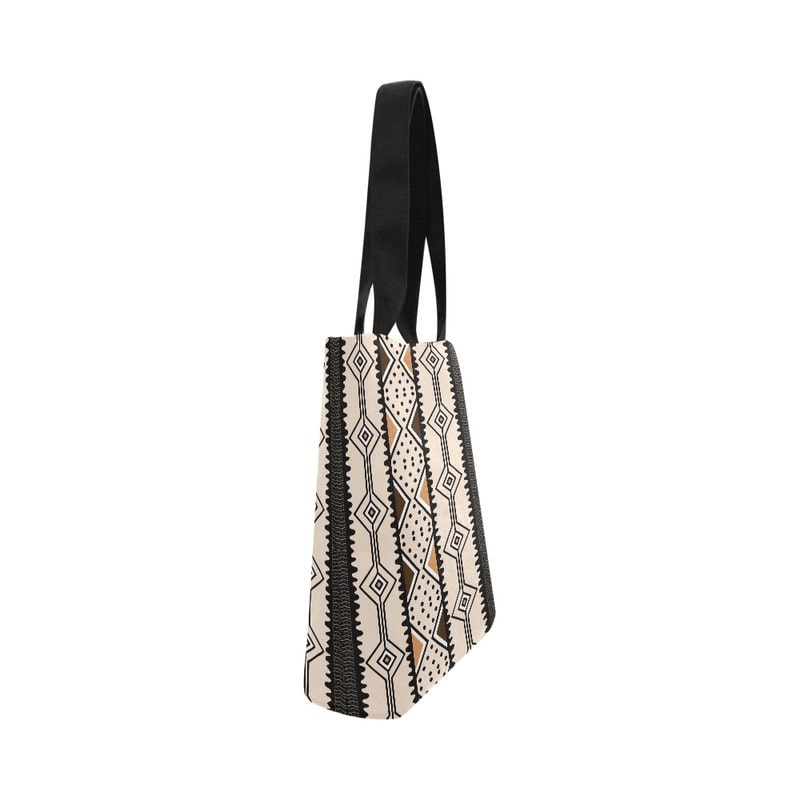 Unleash your adventurous side with our Contemporary African Cloth Bags Tote! Featuring beautiful Abstract Mud Cloth designs and a spacious interior, it's perfect for carrying all your essentials while making a bold statement. Add a touch of culture to your everyday look! Product Description • 510 g/m2. Made from high-grade canvas. • Durable and roomy enough for your daily items. • Lightweight canvas tote bag with sturdy handle is easy to carry. • Perfect for shopping and carrying your essentials. Delivery Time This item will be processed within 3-7 business days (Excluding Weekends and Holidays). Once products ships it can take up to 15 Business days depending on your location. Out of Stock items can be requested by emailing us at [email protected] Care Instructions Machine wash cold inside out. Gentle cycle with mild detergent and like colors. Do not use bleach or fabric softener. Do not tumble dry. Hang to dry to ensure maximum shelf life. Iron inside out if necessary. Do not iron the print. Do not dry clean.