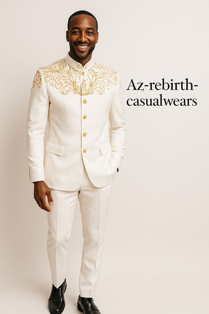 Affichez votre élégance avec ce costume safari brodé de luxe signé Az-rebirth-casualwears. Confectionné avec soin, il se distingue par ses broderies dorées raffinées sur la poitrine et les épaules, et sa coupe structurée met en valeur la silhouette.