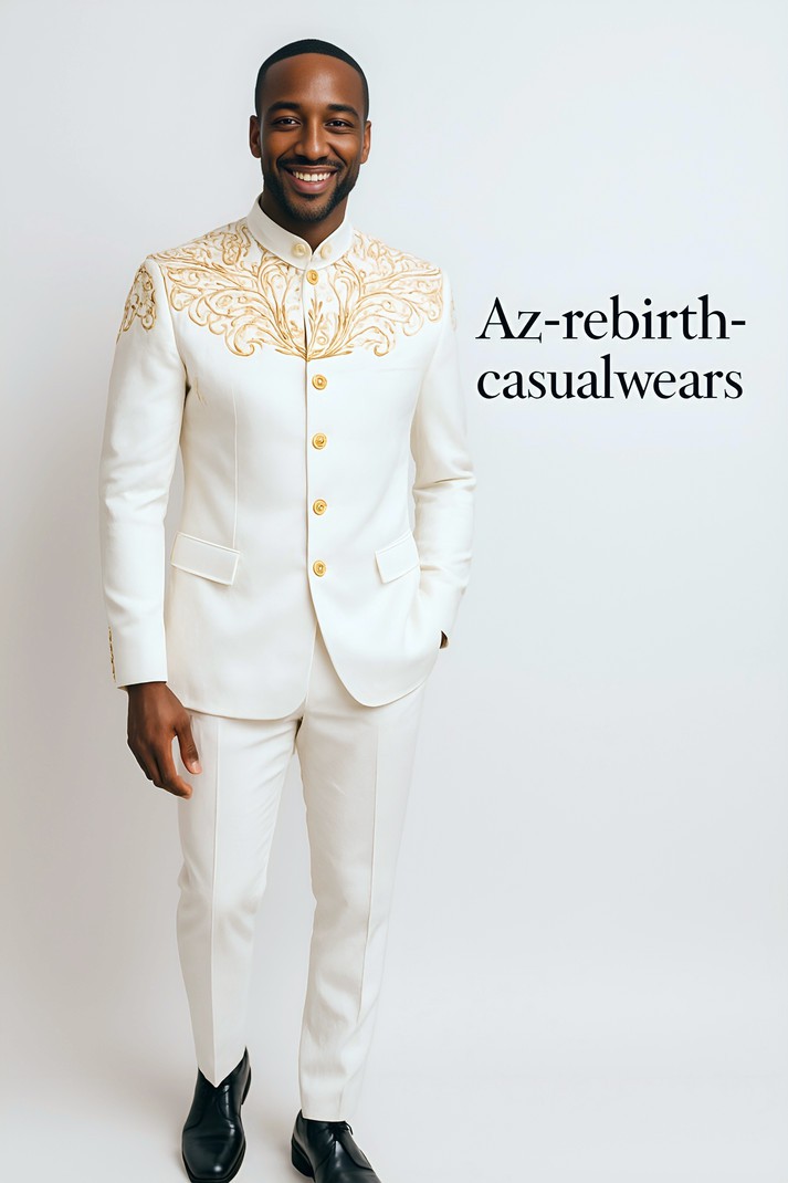 Make a bold statement with this luxurious embroidered safari suit from Az-rebirth-casualwears. Tailored to perfection, this design features exquisite gold embroidery on the chest and shoulders, combined with a structured fit and premium fabric for a modern, regal look.