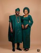 A beautiful and classic deep forest green Aso Ebi set. The male outfit is a distinguished Agbada featuring subtle, tonal embroidered motifs, paired with an Aso Oke cap. The female outfit is a gracefully tailored dress with bell sleeves and a matching Gèlè, both accessorized with traditional red coral beads.