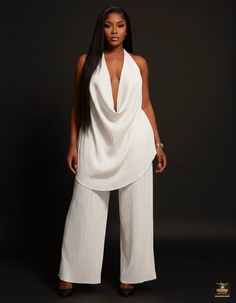 The Copper Drape Backless Halter Set defines contemporary evening elegance, combining tailored structure with seductive fluidity. The rich, white halter top features an asymmetrical cowl-neck drape that spills beautifully across the front, while the back boasts an unexpected, completely open design with delicate criss-cross straps tied at the lower back. This dramatic top is perfectly balanced by the clean, sharp lines of tailored, high-waist white trousers, making it the quintessential outfit for post-work cocktails, upscale bar evenings, or a sleek, modern date night.