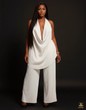 The Copper Drape Backless Halter Set defines contemporary evening elegance, combining tailored structure with seductive fluidity. The rich, white halter top features an asymmetrical cowl-neck drape that spills beautifully across the front, while the back boasts an unexpected, completely open design with delicate criss-cross straps tied at the lower back. This dramatic top is perfectly balanced by the clean, sharp lines of tailored, high-waist white trousers, making it the quintessential outfit for post-work cocktails, upscale bar evenings, or a sleek, modern date night. Material: crepe Color: white