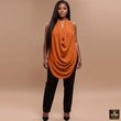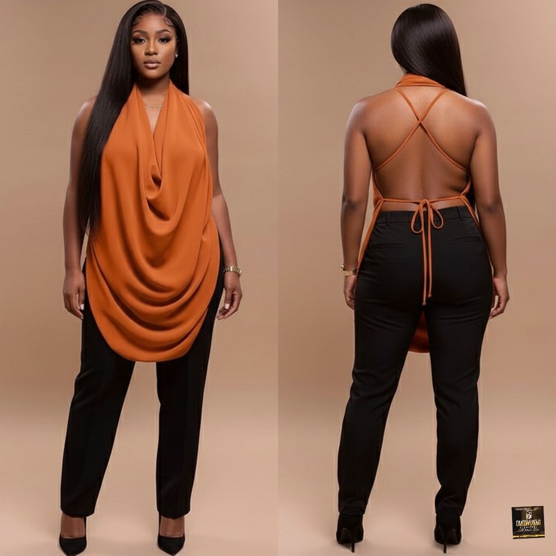 The Copper Drape Backless Halter Set defines contemporary evening elegance, combining tailored structure with seductive fluidity. The rich, burnt orange halter top features an asymmetrical cowl-neck drape that spills beautifully across the front, while the back boasts an unexpected, completely open design with delicate criss-cross straps tied at the lower back. This dramatic top is perfectly balanced by the clean, sharp lines of tailored, high-waist black trousers, making it the quintessential outfit for post-work cocktails, upscale bar evenings, or a sleek, modern date night.