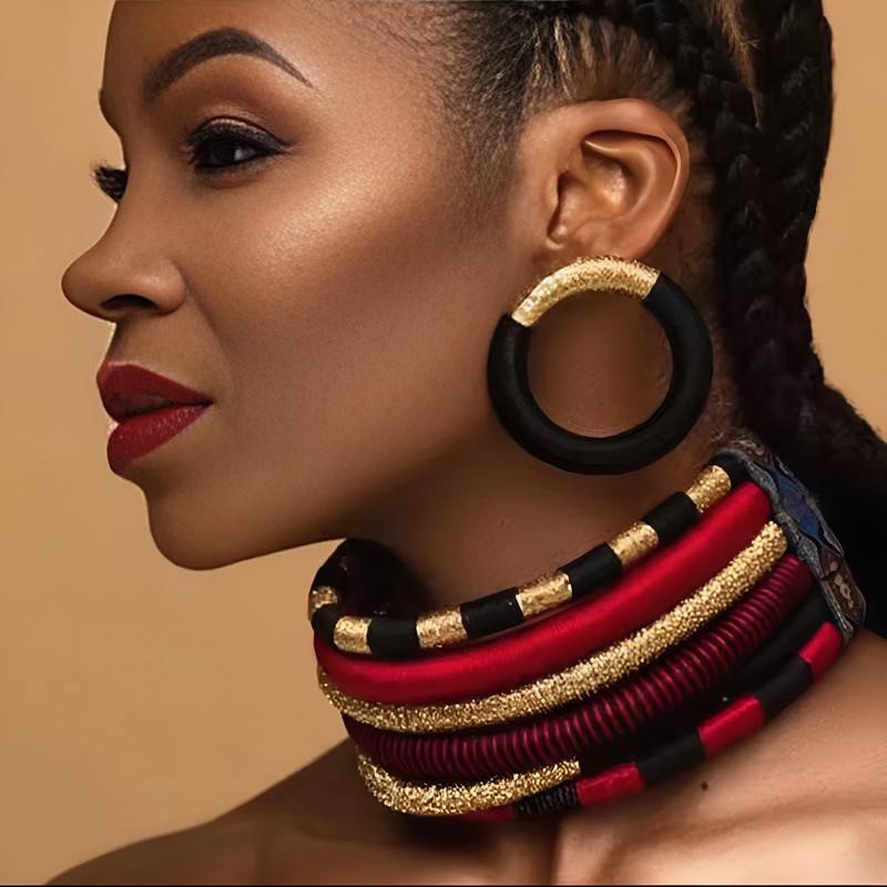 Ce bijou s’inspire directement des colliers traditionnels Maasaï du Kenya et de Tanzanie, portés lors de cérémonies pour symboliser la beauté, la force et le statut. Le rouge, couleur sacrée, représente le courage et la vie ; le noir, l’identité du peuple ; et l’or, la prospérité.