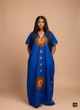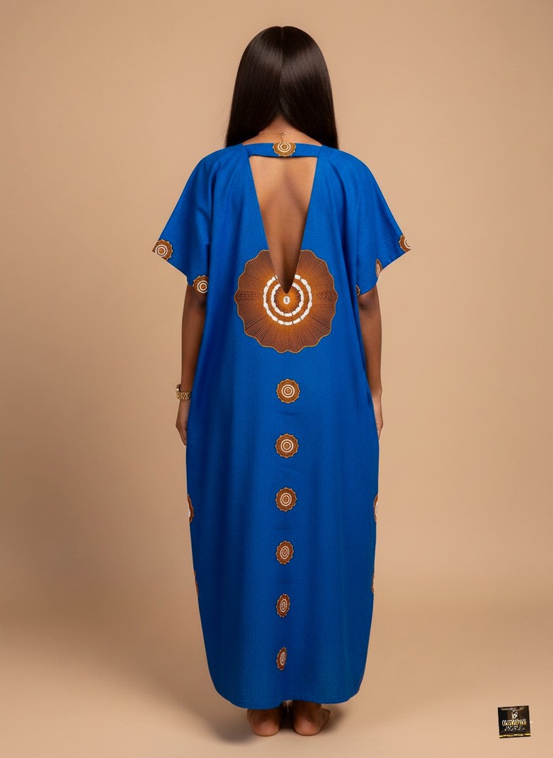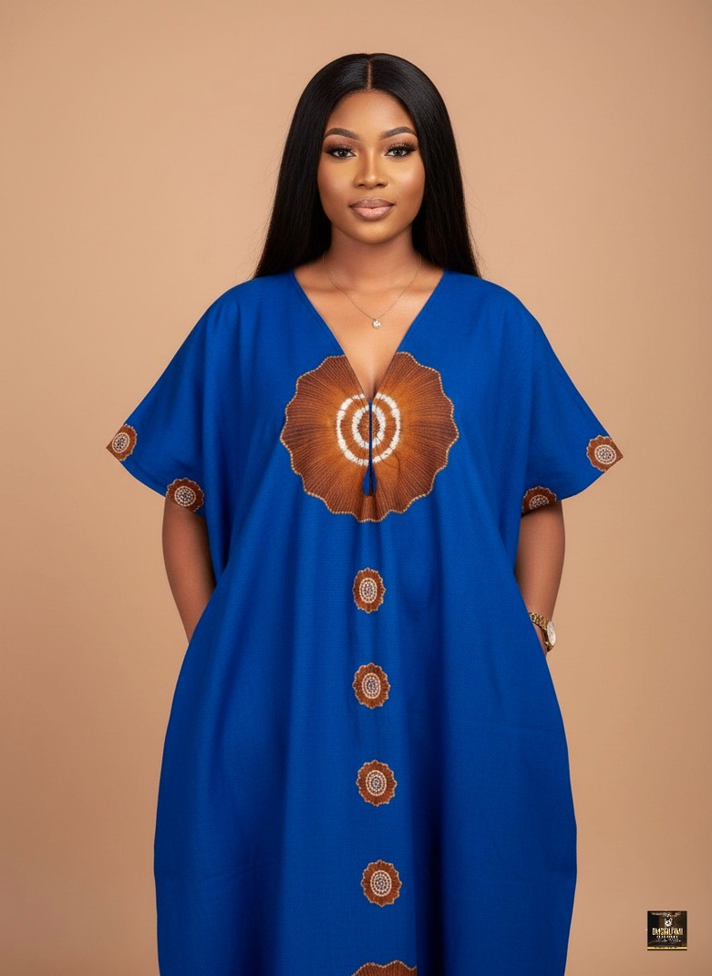 This stunning royal blue maxi dress, designed in a comfortable kaftan/boubou silhouette, is the perfect blend of traditional inspiration and contemporary elegance. Crafted from lightweight ankara fabric, it features a vibrant print of stylized circular floral motifs in rich earthy browns and oranges, reminiscent of classic African Adire /Batik techniques. The design boasts a flattering, deep V-neckline on the front and a dramatic, elegant deep V-back cutout, making it striking from every angle. The loose, flowing cut and short cap sleeves ensure maximum comfort and breathability, while the inclusion of practical side pockets adds a modern touch. This versatile piece is ideal for a variety of occasions, from an elegant resort look or a chic summer party to a relaxed yet stylish ensemble for a casual weekend outing.