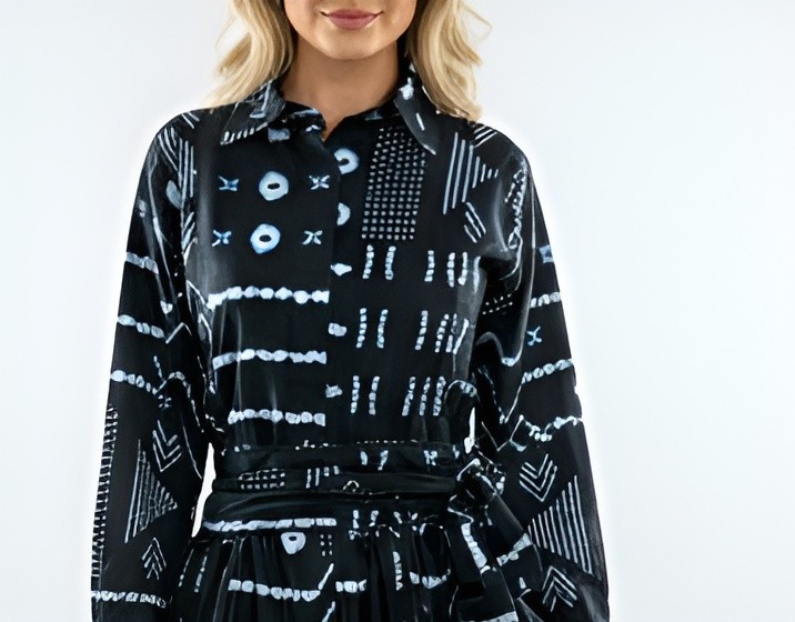 This indigo print shirt dress combines timeless elegance with everyday comfort. Designed with a classic collared neckline, fitted bodice, and a full pleated midi skirt, it flatters every silhouette while allowing effortless movement. The striking blue geometric pattern is digitally printed for a vibrant finish that won't fade with washing, giving you long-lasting color and quality. Details: Button-down front with tailored bodice High-quality digitally printed fabric (non-fade) Side pockets for comfort and functionality Midi length with a full, twirl-worthy skirt Perfect for workdays, brunches, and cultural gatherings — style it with heels for sophistication or sneakers for a relaxed chic look.