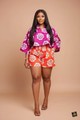 Capture the vibrancy of summer with this stunning two-piece shorts set, featuring a playful and eye-catching mix-and-match print design. The ensemble includes a cropped, kimono-style top in a brilliant pink with a white floral pattern, complemented by high-waisted shorts in a warm orange color featuring a similar white/light orange floral motif. The garments are constructed from a crisp, breathable ankara batik fabric, ensuring comfort and a beautiful drape in warm weather. The top has wide, relaxed sleeves and a loose fit, while the shorts feature a comfortable elastic or drawstring waist. This bold and colorful set is an ideal choice for tropical holidays, beach parties, summer festivals, or any vibrant daytime event where you want to make a fun, stylish statement.