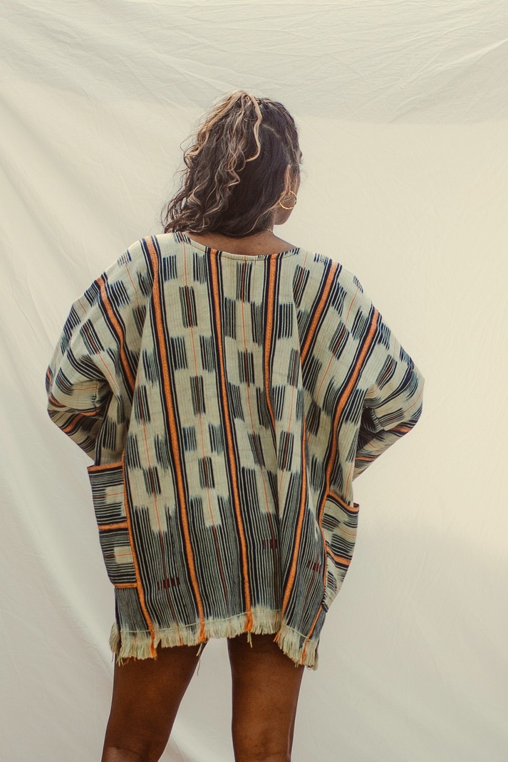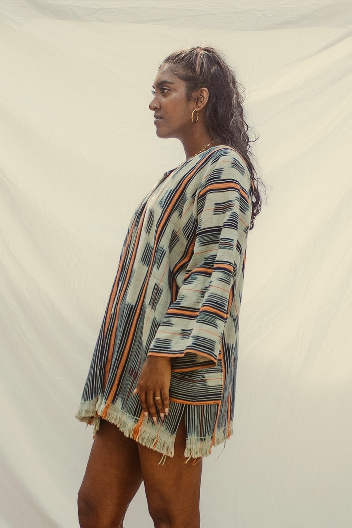 Employing environmentally friendly materials and pursuing new standards in craftsmanship, Threaded Tribes is committed to providing the highest quality, uniquely ethical essentials for your closet. Due to the nature of the fabric, tiny spaces within the seams, an organically neutral scent or a slight variation in pattern may naturally occur. This cloak has a beautiful small patchwork of blue thread on the right shoulder.