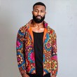 Beautiful patterned Bomber jacket with a stunning mix of colors. The jacket has bold patterns to make a statement wherever you go. The bomber jacket is perfect for the cooler months and will keep you warmer.