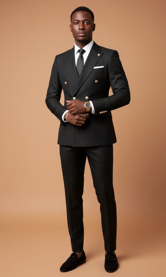 Presenting a sartorial masterpiece, this sophisticated double-breasted blazer is cut from a luxurious black fabric, offering a rich, distinctive color that commands attention. The jacket features a classic peak lapel and is elegantly adorned with six gold-tone tone buttons, two functional for closure and four decorative, lending a touch of refined vintage flair. Paired impeccably with slim-fit, trousers, the look achieves a perfect balance between bold color and timeless elegance, making it an ideal ensemble for formal events, sophisticated social gatherings, or professional settings where distinction is key, completed by a crisp white shirt and dark leather shoes.