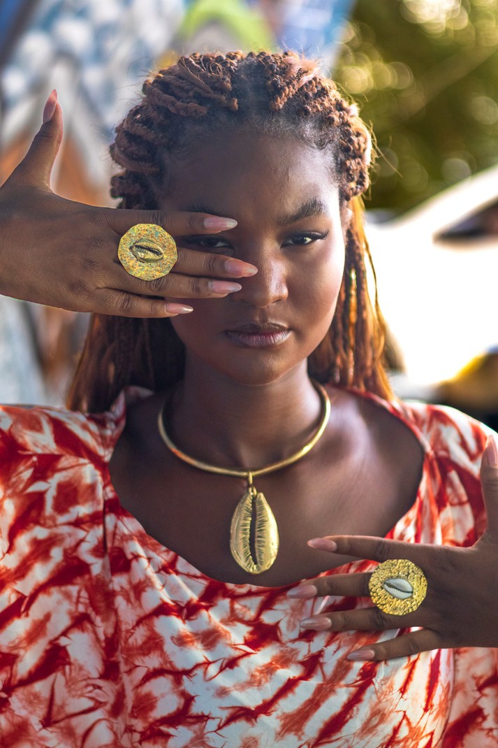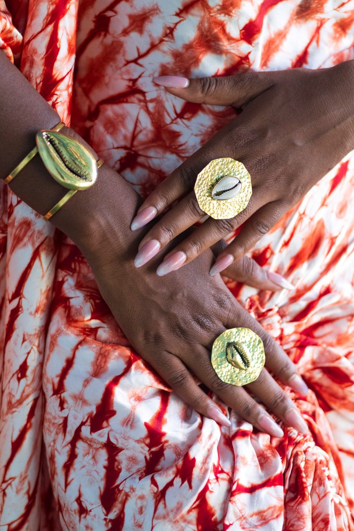 La seconde met en lumière un cercle orné d’un cauri doré, pour une touche lumineuse et affirmée.