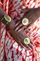 La première bague présente un cercle délicat entourant un cauri blanc, symbole de féminité et de protection.