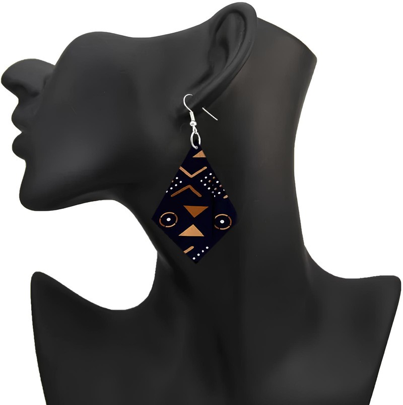 Ces boucles d'oreilles imprimées d'un design original sublimeront votre tenue. Forme : diamant Matériau : bois Dimensions : 6 cm de grand diamètre/3 mm d'épaisseur