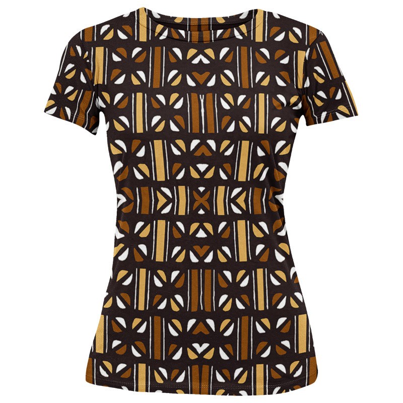 This Afrocentric Mudcloth Women T-shirt in brown is a unique piece that combines traditional African mudcloth design with a modern fit. Made with high-quality materials, this shirt offers both style and comfort. Showcase your individuality and cultural appreciation with this one-of-a-kind t-shirt.