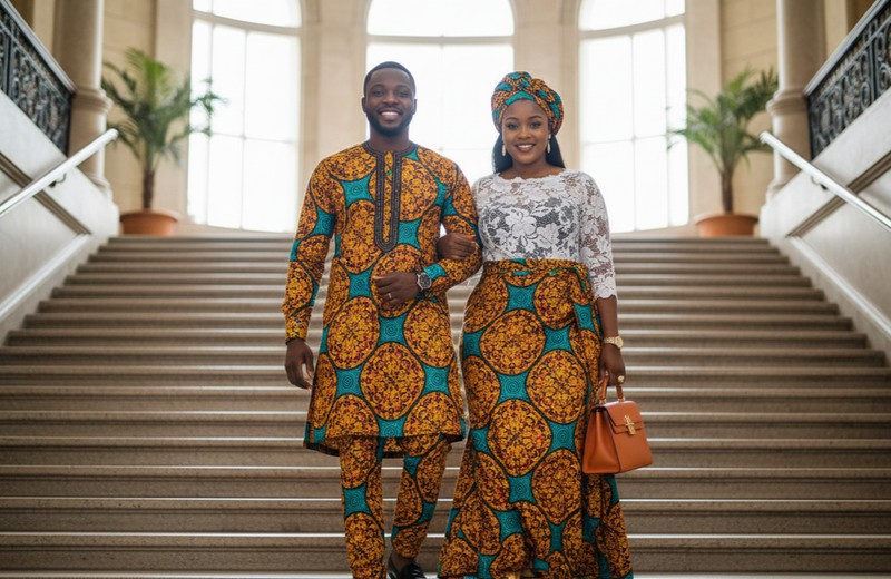 For Her: The woman's outfit showcases a beautifully crafted fitted white lace blouse that offers a refined and sophisticated contrast. This is paired with a gracefully wrapped Ankara-style skirt and a matching headscarf made from the same rich, patterned fabric. She carries a chic handbag, completing a look of timeless grace and modern elegance.