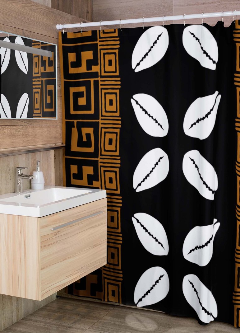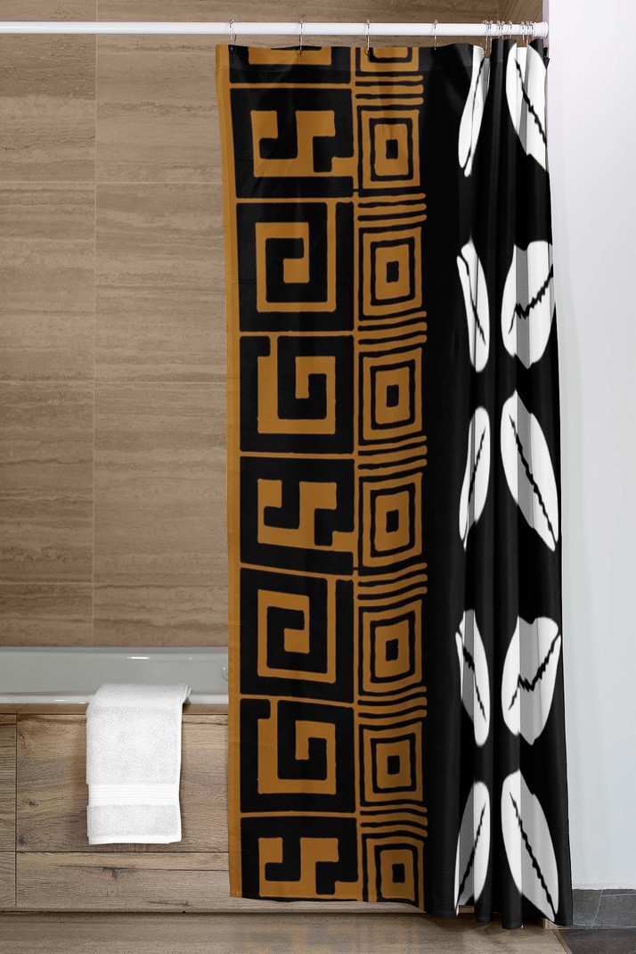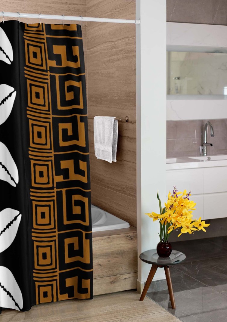 Transform your bathroom into a daring oasis with our Elegant Black Shower Curtain featuring a stunning cowrie print. Embrace risk-taking and add a touch of adventure to your daily routine. Made with high-quality material for lasting durability. Upgrade your bathroom today!