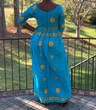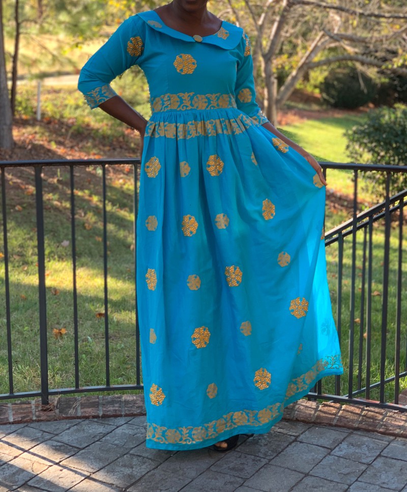 Elegant blue and gold cotton maxi dress Material: cotton Color: blue Pattern Type: solid Fabric: Fabric has no stretch Care Instructions: Machine Wash and Air Dry/Dry Clean