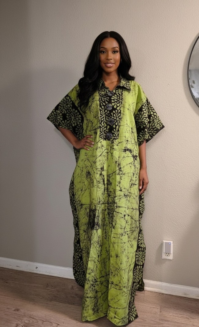 Shop our stunning green and black kaftan dress, featuring intricate prints and a comfortable, flowing silhouette. Perfect for casual outings or special occasions, this versatile piece combines style and comfort effortlessly. Made from high-quality materials, it is designed to flatter all body types. Available in various sizes. Elevate your wardrobe with this chic addition today!