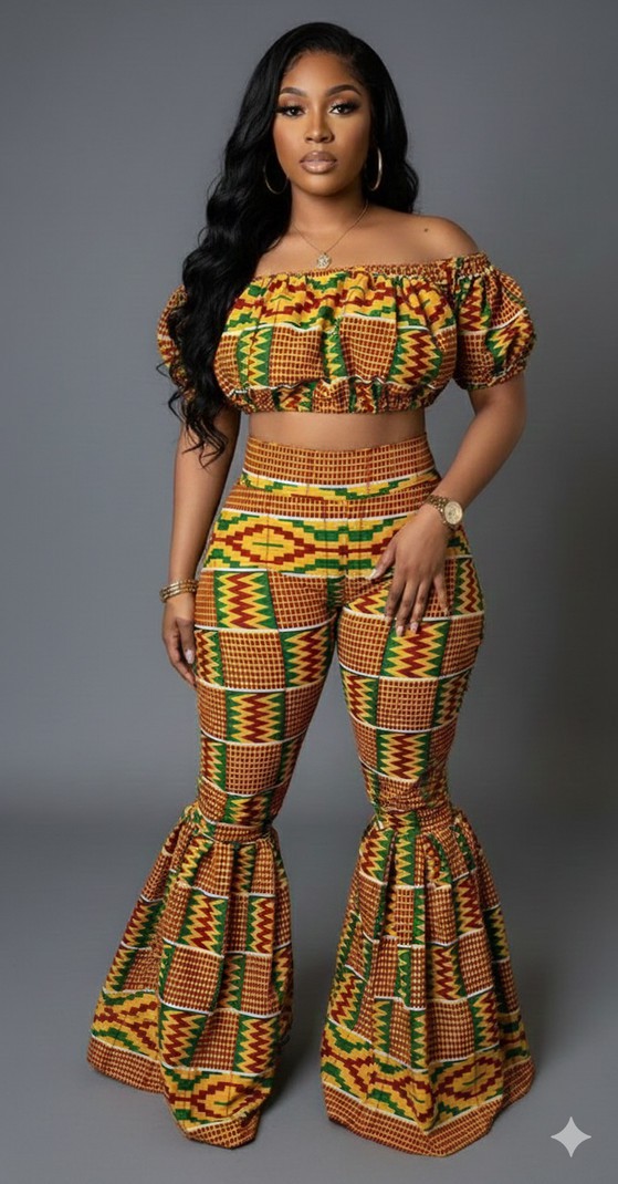 Step out in style with our Elegant Kente Print Two-Piece Set! This stunning ensemble features a charming off-the-shoulder crop top with ruffled sleeves and coordinating flared pants, designed to accentuate your curves and exude confidence. The vibrant Kente patterns celebrate African heritage, making it a perfect choice for special occasions, festivals, or a night out.