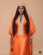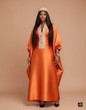 This magnificent kaftan maxi-dress is a striking garment defined by its vibrant color and regal, flowing silhouette, making it an outstanding choice for special occasions. The dress features a dramatically oversized and flowing kaftan or boubou silhouette with voluminous sleeves, ensuring a majestic drape and ultimate comfort, and is constructed from a smooth, substantial silk-blend fabric in a captivating deep orange or burnt amber hue that possesses a subtle, beautiful sheen. The garment is elegantly accented by a tailored V-neck insert and coordinating high collar/neck band in a contrasting tan or gold textured brocade fabric, creating a sophisticated focal point and a textural contrast. This luxurious and comfortable ensemble, often paired with a matching head wrap or hat like the model's, is an ideal choice for occasions such as traditional weddings and cultural ceremonies, upscale holiday gatherings, gala dinners, or any significant event where a dignified, sophisticated, and powerfully colored ensemble is desired.