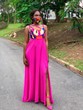 Dress is fully embroidered at the bodice with straps. Bottom part is made from crepe with a slit in front. Dress has a zip at the back. Made to order. Dry clean only.