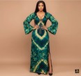 A breathtaking full-length gown in a lush green and sun-yellow tie-dye (Adire/Batik-style) pattern. It features dramatic bell sleeves and a deep V-neckline secured with a fashionable lace-up detail (corset-style tie). The high side-slit adds a touch of glamor and movement. Perfect for a vacation, beach wedding, or a glamorous evening out. Style: Bohemian-Glamour. Material: batik crepe Color: green