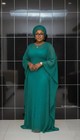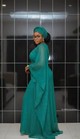 This elegant, flowing boubou dress is made from beautiful emerald green lace fabric. It comes with a matching turban headwrap, making it a complete outfit.