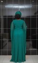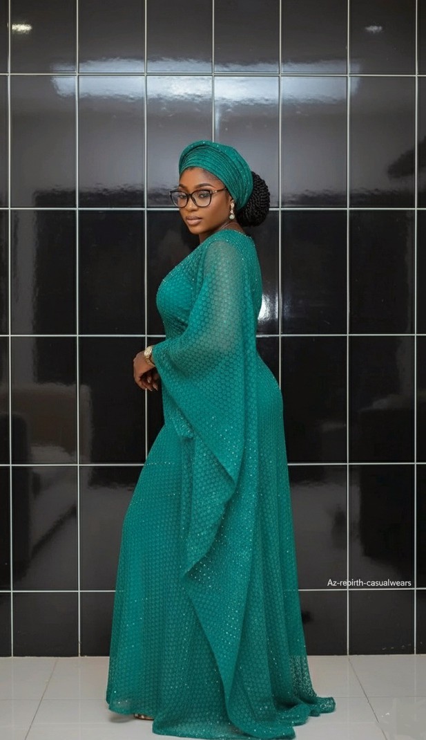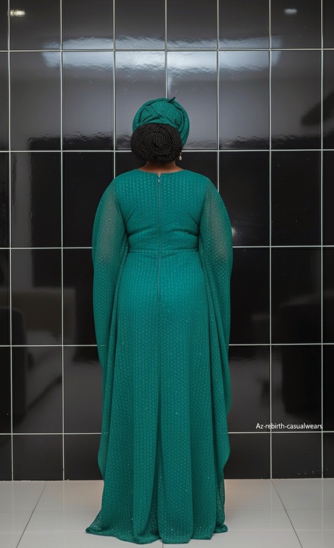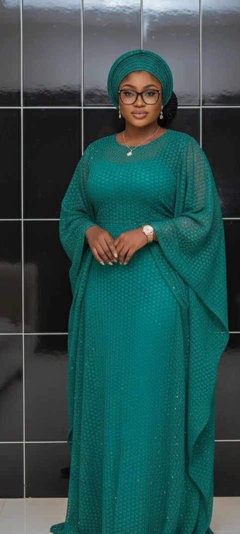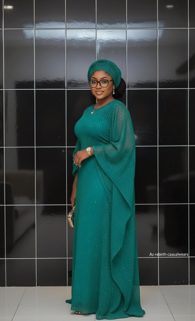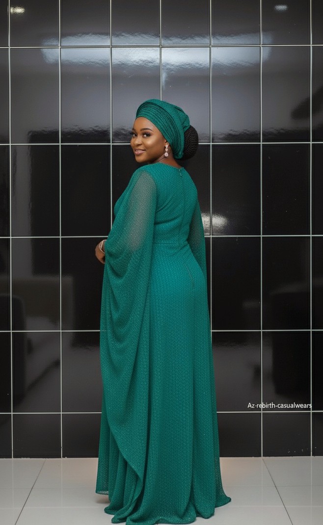 Emerald Green Boubou Dress and Turban Set This elegant, flowing boubou dress is made from beautiful emerald green lace fabric. It comes with a matching turban headwrap, making it a complete outfit. The style is loose, comfortable, and perfect for special occasions like weddings or parties. It's a classic African design that's both stylish and easy to wear.