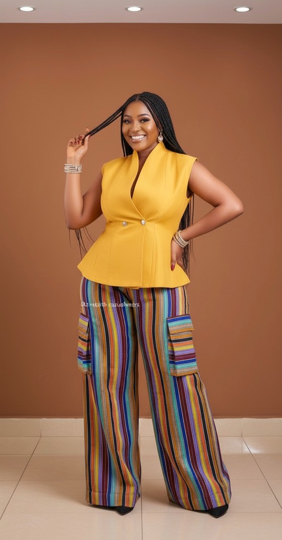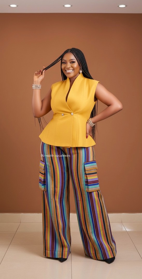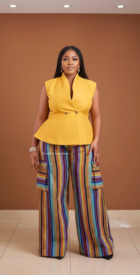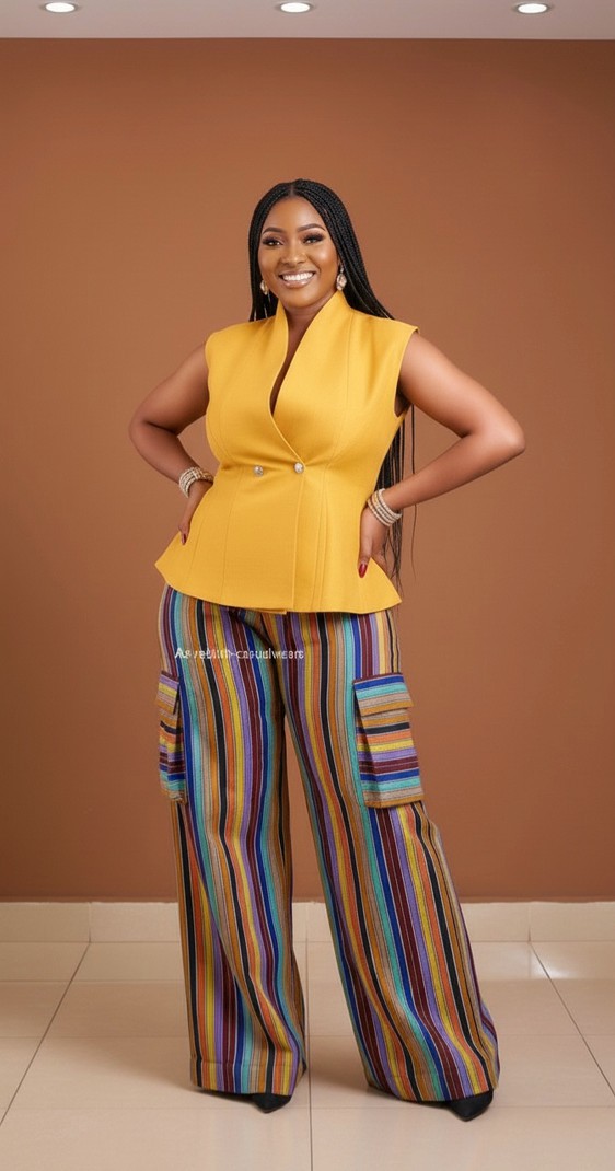 Vibrant Striped Trousers and Peplum Set A bold and stylish two-piece set perfect for a statement look. The Top: A structured, sleeveless peplum top in bright Mustard Yellow. It features a sharp collar, a deep V-neckline, and an asymmetrical button closure. The Trousers: High-waisted, wide-leg palazzo cargo trousers in a colorful, vertical Kente-style stripe print. They include large side cargo pockets for a modern, functional edge. Key Features: Flattering peplum silhouette. Wide-leg, comfortable trousers. Vibrant, eye-catching striped print. Shipping: Fast shipping available. Sizes: Available in all sizes. Vibrant Striped Trousers and Peplum Top Set A bold and stylish two-piece set perfect for a statement outfit. The Top: A structured, sleeveless peplum top in bright Mustard Yellow. It features a sharp collar, a deep V-neckline, and an asymmetrical button closure. The Pants: High-waisted, wide-leg palazzo cargo pants in a colorful Kente-style vertical stripe print. They feature large side cargo pockets for a modern and functional touch. Key Features: Flattering peplum silhouette. Comfortable wide-leg pants. Vibrant and eye-catching stripe print. Shipping: Expedited shipping available. Sizes: Available in all sizes.