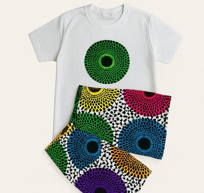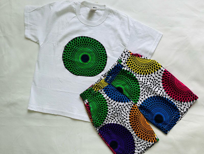 Ensemble pour petit garçon en wax customisé. Le t-shirt est customisé avec une touche de wax, il est en coton 100%. Le short est en wax de coton également. L' ensemble est idéalement à porter pour les beaux jours.