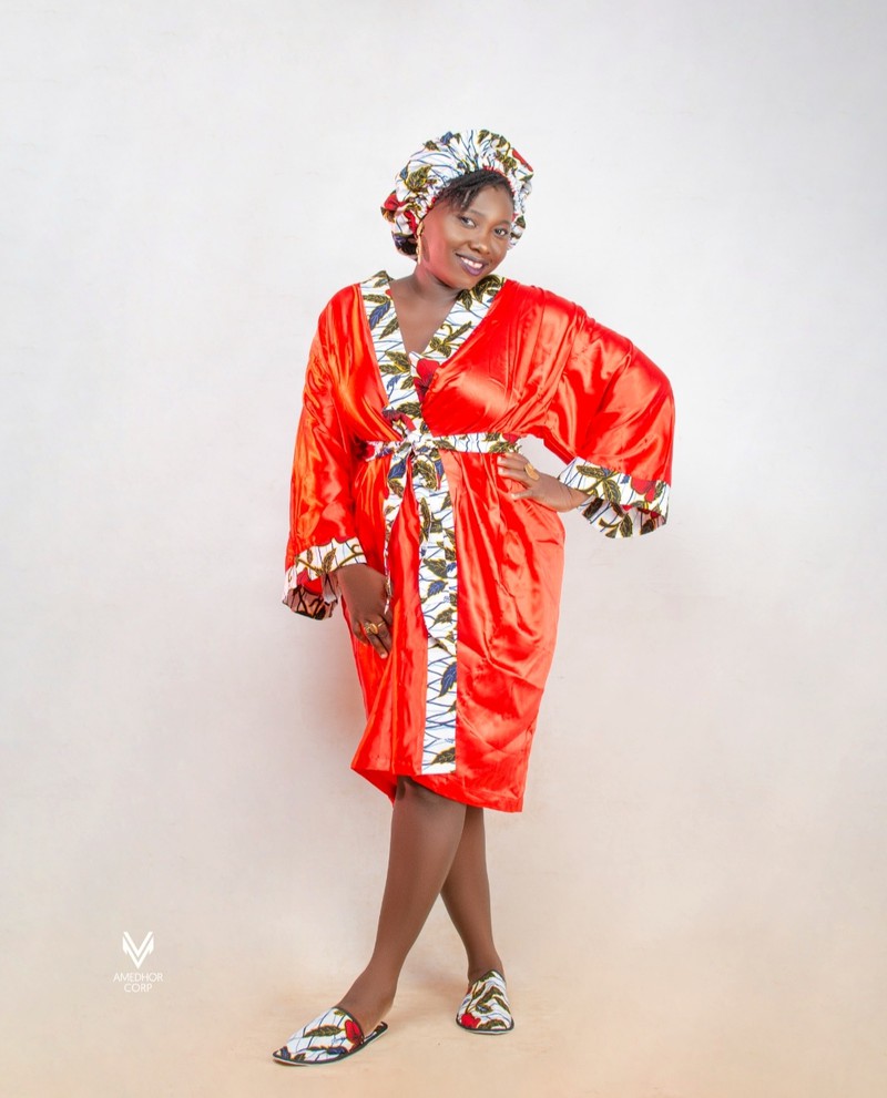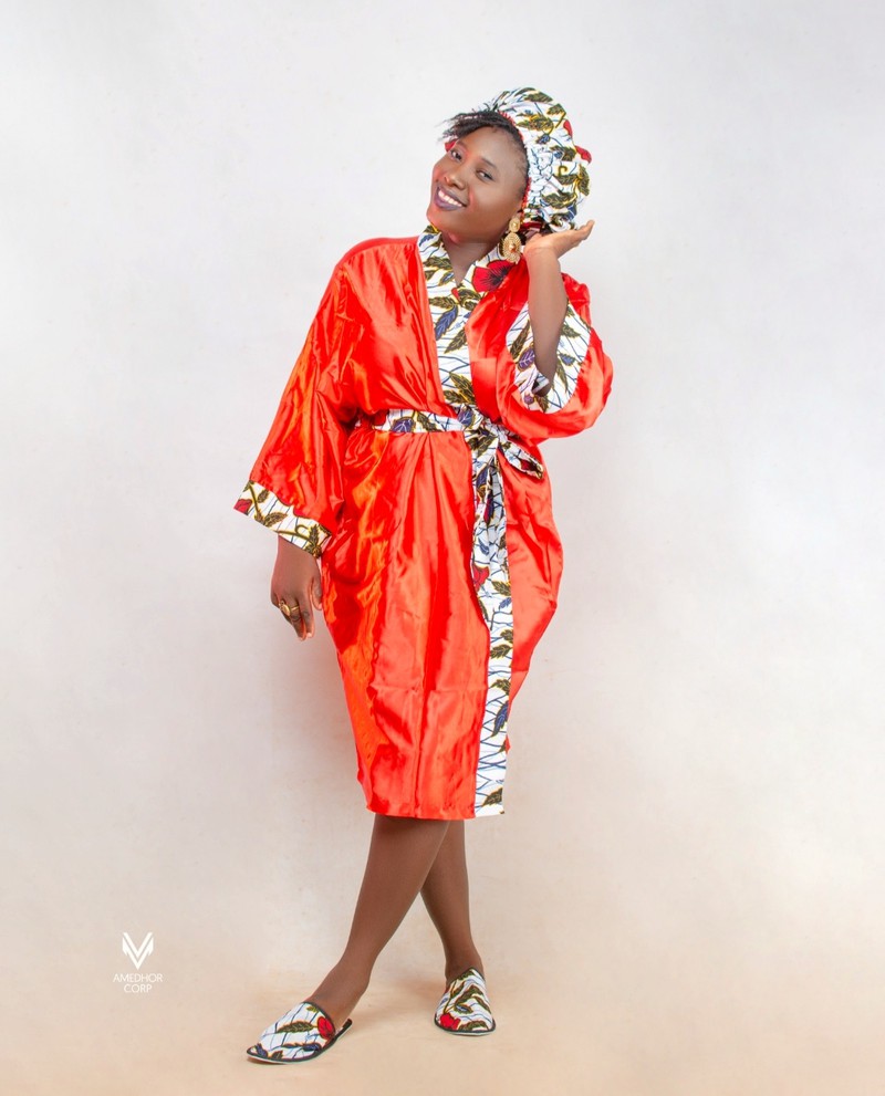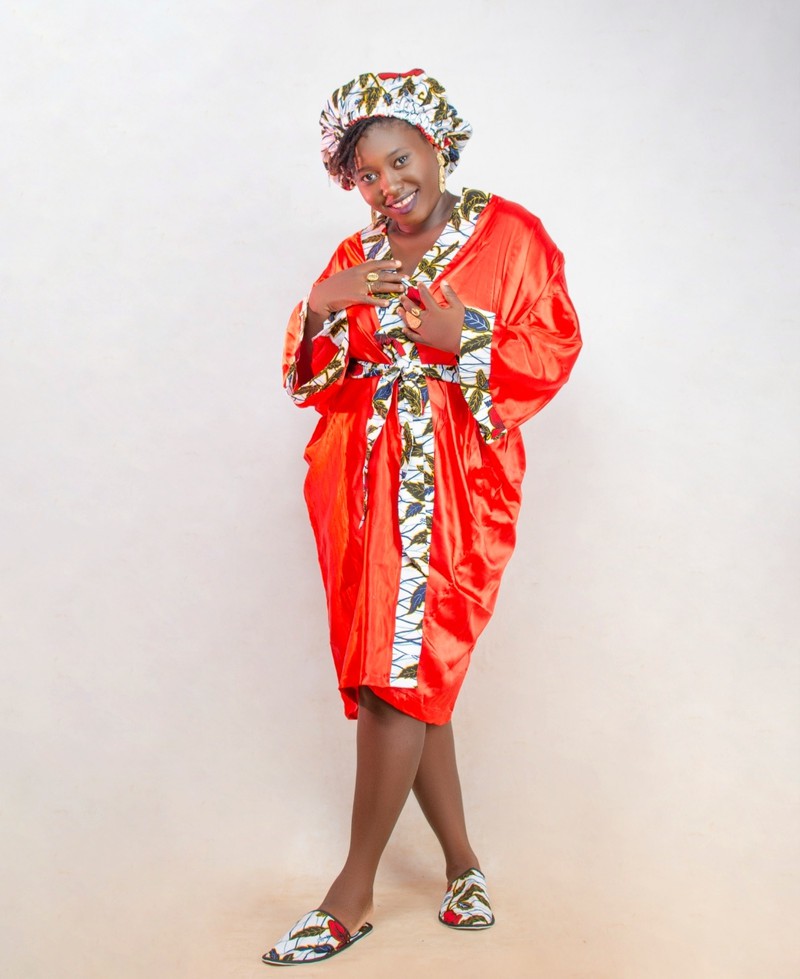 Ajoutez une touche d'élégance et de confort à votre routine avec cet ensemble unique, conçu pour allier style et douceur. Cet ensemble comprend un peignoir, un bonnet et des chaussons, tous fabriqués à partir d'un mélange raffiné de satin doux et de tissu wax vibrant, pour un style qui vous démarquera.