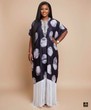 Embrace majestic comfort with this stunning maxi kaftan dress, blending traditional flow with contemporary detailing. The dress features a rich, dark indigo or black fabric adorned with a bold, contrasting white/grey circular spot print, achieved through a sophisticated Adire or tie-dye resist technique. The silhouette is a generous, flowing kaftan style with comfortable short sleeves, designed to suit various body types. Adding a touch of elegance, the deep V-neckline is beautifully highlighted by intricate white embroidery detail. The most distinctive feature is the dramatic white fringe detailing along the hemline, adding graceful movement and texture. Constructed from a lightweight, breathable ankara batik fabric, this dress is the epitome of comfort and style. It is perfectly suited for resort wear, stylish vacation dinners, relaxed daytime events, or as an effortlessly chic piece for sophisticated lounging.