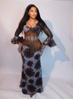 The Fatima Ensemble embodies feminine elegance in all its splendor. This signature design combines the timeless charm of floral wax with the sophistication of a beaded corset, designed to enhance every silhouette. Its handcrafted top, adorned with shimmering beads in copper and gold tones, adds a unique touch of refinement. The long skirt in premium wax balances the ensemble with natural grace and a regal allure. Model details: • Structured corset adorned with handcrafted beads • Sheer tulle sleeves with ruffled finishes • High-waisted long skirt in exclusive floral wax • Fitted and flattering cut • Inner lining for optimal comfort Colors: Harmony of copper, chocolate and gold, on a background of floral gray wax. Materials: • Premium African wax • Delicate tulle • Hand-embroidered beads Available sizes: M • L • XL Occasions: Weddings | Receptions | Prestigious dinners | Traditional ceremonies