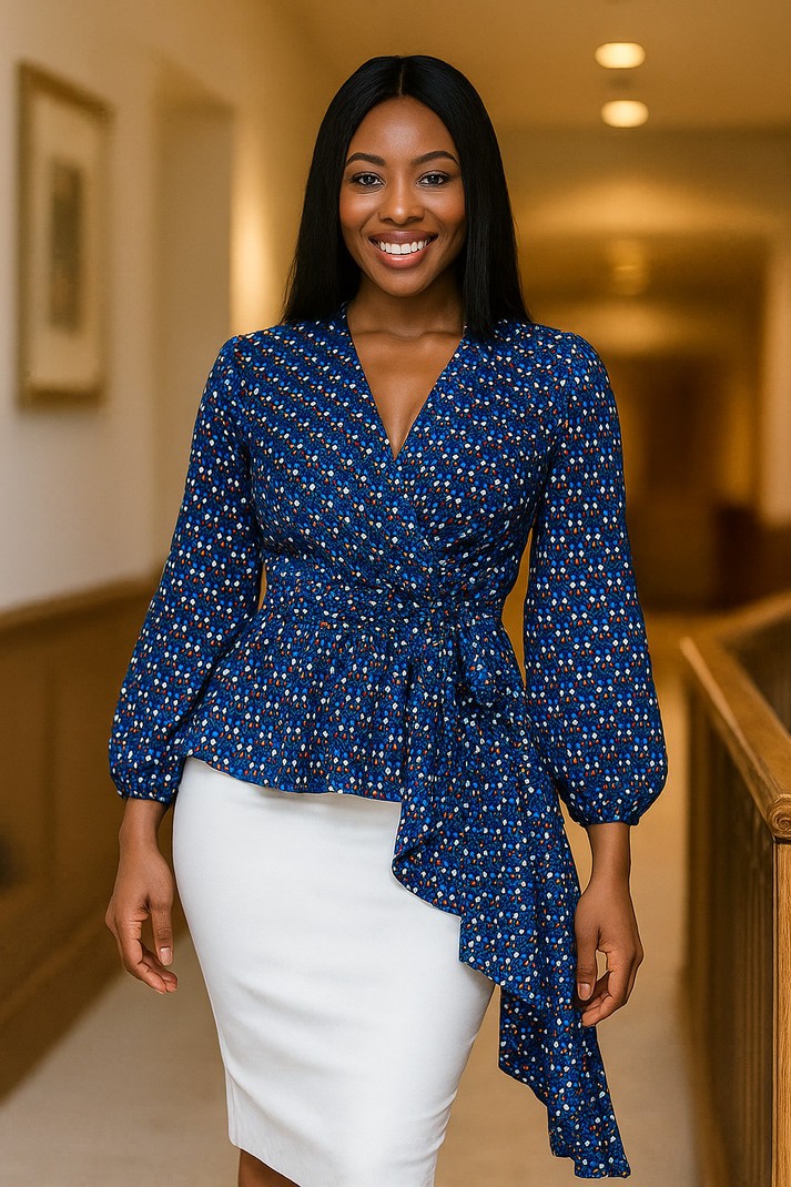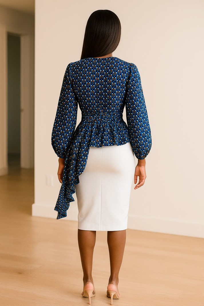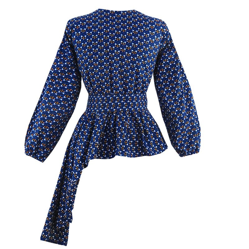 Elevate your wardrobe with this Faux Wrap African Blouse, featuring an elegant asymmetrical design and long sleeves for a refined look. Crafted to offer both style and comfort, it effortlessly complements various outfits, making it perfect for any occasion. Embrace a unique blend of cultural flair and modern sophistication with this versatile blouse.