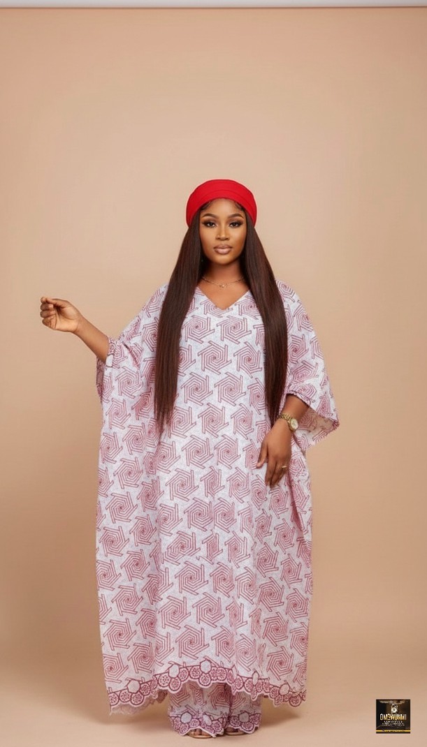 Capture modern traditional elegance with our Geometric Print Kaftan, a flowing masterpiece designed for sophisticated comfort and striking presence. This luxurious, floor-length gown features a clean white base fabric adorned with an intricate, repeating mauve/reddish geometric spiral pattern, creating a dynamic visual texture that is both captivating and refined. The wide-cut silhouette drapes effortlessly, enhanced by a flattering V-neckline and generous, airy sleeves, ensuring ease of movement and a relaxed fit. Adding a layer of exquisite detail, the bottom hem is finished with a wide band of delicate cutwork and eyelet embroidery, which elevates the traditional style with a touch of artisan craftsmanship, making this Kaftan the perfect choice for elevated daytime events or chic evening wear.