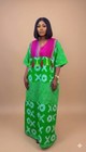 This vibrant emerald green maxi dress is a masterful showcase of playful design and traditional craftsmanship, expertly constructed from premium, breathable hand-dyed Adire cotton that offers a structured yet graceful silhouette for all-day wear. The garment features a whimsical white "XO" motif scattered across the body, beautifully contrasted by a central band of fine horizontal ripples that add a rhythmic texture to the midsection. Its design is elevated by a striking fuchsia pink bib at the neckline, framed by multi-colored vertical stripes and finished with a row of alternating red and lime green hand-tied tassels that create a dynamic, tactile focal point. With its relaxed kaftan-style fit and wide, elbow-length sleeves, this dress is the perfect statement piece for festive garden parties, upscale tropical vacations, or creative social gatherings, offering a joyful blend of heritage-inspired textile art and bold, modern color-blocking.