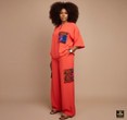 Exude confidence in this eye-catching, vibrant coral pant set. The ensemble features a relaxed, oversized tunic top with elbow-length sleeves and a matching pair of high-waisted, wide-leg trousers. Both pieces are crafted from a soft, solid coral/red-orange fabric. The look is finished with unique, square patch pockets on the top and the pants, which are adorned with small, vibrant African print fabric squares for a pop of texture and color.