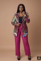 A celebration of color and geometry. This set features a structured blazer in a kaleidoscope of jewel-toned geometric patterns (blues, oranges, and greens). It is expertly coordinated with solid magenta trousers that offer a sleek, tailored fit. The contrast between the busy print and the solid bold bottom creates a balanced, high-fashion aesthetic. Perfect For, Creative office environments or networking mixers. Material: Ankara, crepe Color: Multicolor