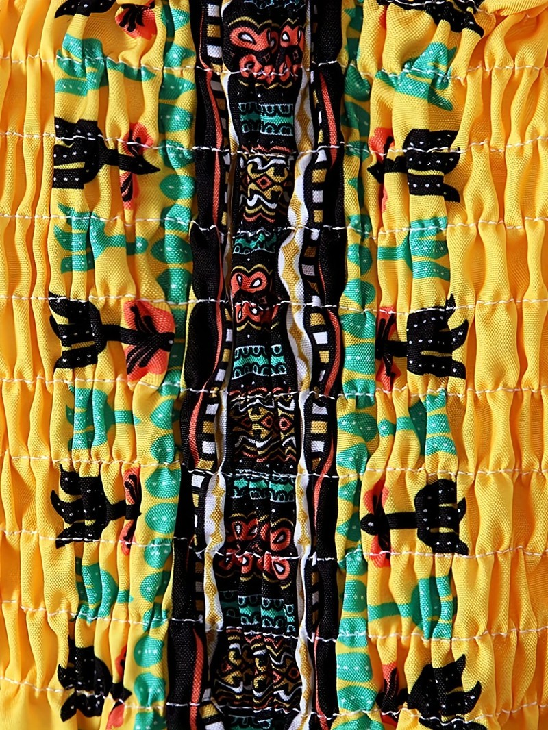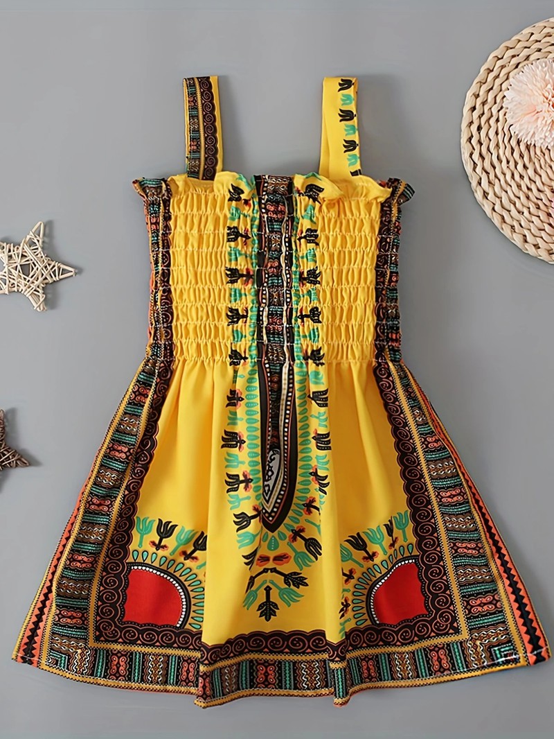 Girls Boho Midi Dress, Summer African-Inspired Sleeveless Slingback with Ruffle Trim, Geometric-Patterned Polyester 100% Fit and Flare Dress for Children