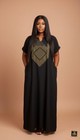 This luxurious maxi kaftan is a picture of understated glamour, cut from a flowing deep black fabric that offers both comfort and a sophisticated drape. The kaftan features a comfortable V-neckline and short sleeves, with the silhouette enhanced by convenient side seam pockets. The centerpiece of the design is the large, eye-catching geometric motif on the chest, executed in shimmering gold rhinestones work. This square and diamond design adds a contemporary, high-fashion element to the traditional garment, making this piece an ideal choice for elegant evening events, upscale cultural celebrations, or resort wear where a statement of refined style is desired.