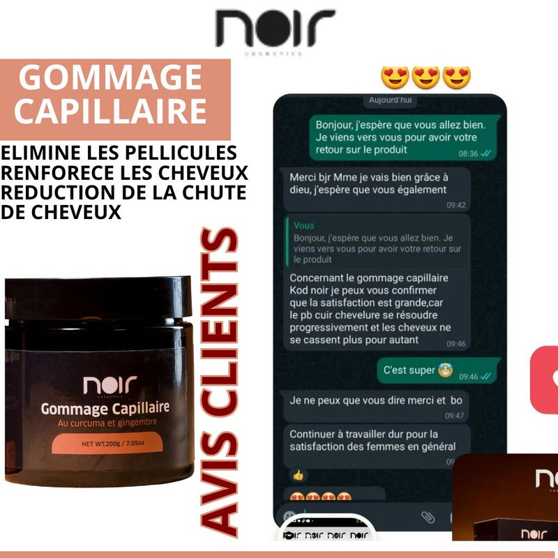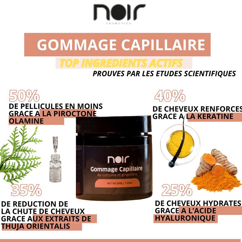 🌿 Gommage Capillaire Purifiant – Anti-Pellicules & Booster de Croissance Offrez un nouveau souffle à votre cuir chevelu grâce à notre **Gommage Capillaire enrichi en Piroctone Olamine, Curcuma, Kératine et Extrait de Thuja Orientalis**. Ce soin puissant et naturel nettoie en profondeur, rééquilibre le cuir chevelu et stimule la croissance des cheveux, tout en réduisant pellicules, excès de sébum et inflammations. ✅ **Pourquoi l’adopter ?** * **Purifie & détoxifie** : élimine impuretés, résidus et cellules mortes * **Lutte contre les pellicules & l'excès de sébum** : grâce à la **Piroctone Olamine** * **Répare & fortifie** : la **Kératine hydrolysée** restructure la fibre capillaire * **Hydrate intensément** : l’**Acide Hyaluronique** retient l’humidité * **Stimule la pousse & réduit la chute** : l’**extrait de Thuja Orientalis** favorise une chevelure plus dense 🌿 **Ingrédients clés & résultats cliniquement prouvés** : * **Piroctone Olamine** : -50 % de pellicules en 2 semaines\* * **Curcuma** : -60 % d’impuretés & inflammations\* * **Kératine Hydrolysée** : +35 % de résistance en 3 mois\* * **Acide Hyaluronique** : +25 % d’hydratation\* * **Thuja Orientalis** : -35 % de chute capillaire en 6 semaines\* > \*Sources : Études publiées dans des journaux scientifiques de dermatologie et cosmétique (2011 à 2016) 💆‍♀️ **Mode d’utilisation** : Appliquez sur cuir chevelu mouillé **après le shampoing**. Massez délicatement pendant **3 à 5 minutes** en effectuant des mouvements circulaires, puis rincez à l’eau tiède. **Fréquence** : 1 à 2 fois par semaine. 📦 **Format** : 250 ml Produit formulé avec **le meilleur de la nature et de la science**, pour une routine capillaire innovante et respectueuse de votre cuir chevelu. 🧬 Inspiré de la tradition et de la recherche, conçu avec passion pour sublimer tous types de cheveux. 🌍 Marque camerounaise — Naturellement engagée.