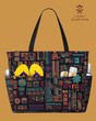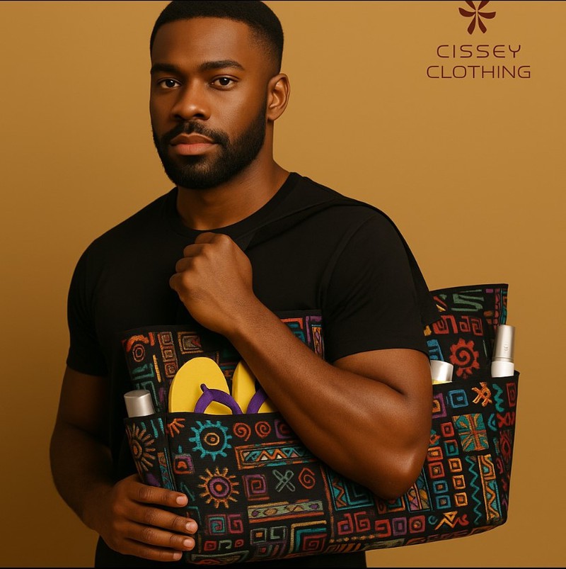 Made from printed polyester with a waterproof effect, each bag highlights a colorful pattern inspired by African art and culture.