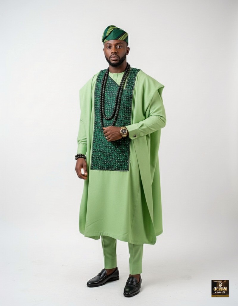 Make a bold statement with this luxury green agbada set, a perfect blend of tradition and modern sophistication. Expertly tailored from premium quality fabric, this three-piece outfit includes a long embroidered agbada robe, a matching inner top, and well-fitted trousers. The detailed embroidery adds a regal touch, making it ideal for weddings, traditional ceremonies, and special occasions. This outfit represents the essence of African men's fashion, offering both elegance and comfort for the stylish gentleman. Premium-quality, breathable fabric Exquisite embroidery detailing Comfortable tailored fit Suitable for weddings, engagements, and cultural events Style Tip: Complete the look with loafers or leather sandals and a matching cap for a royal appearance.