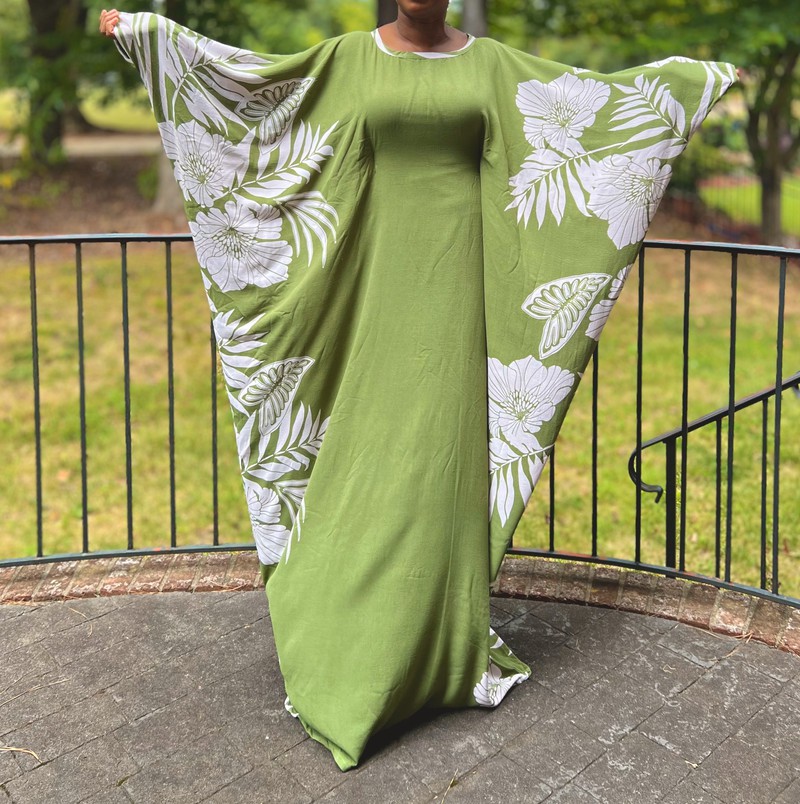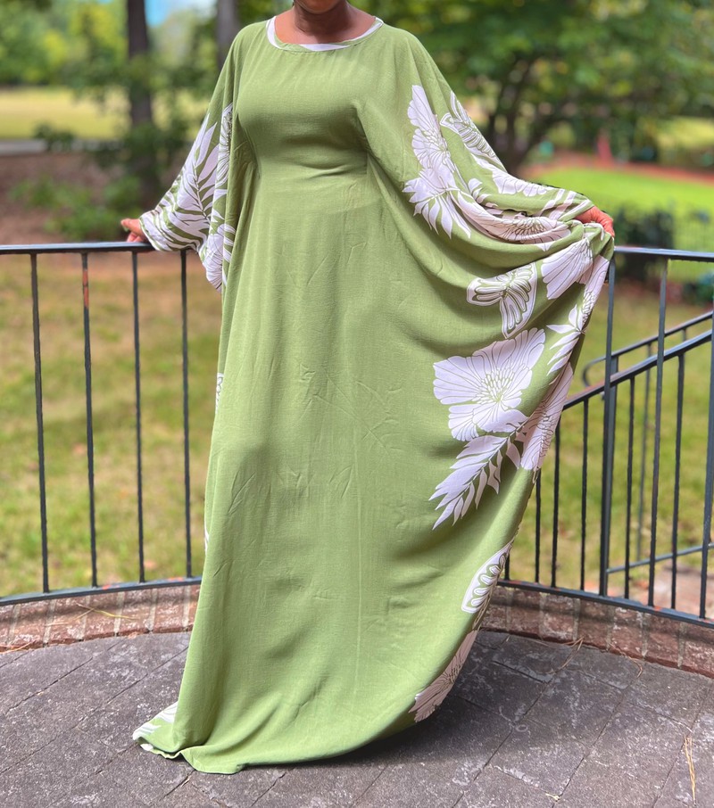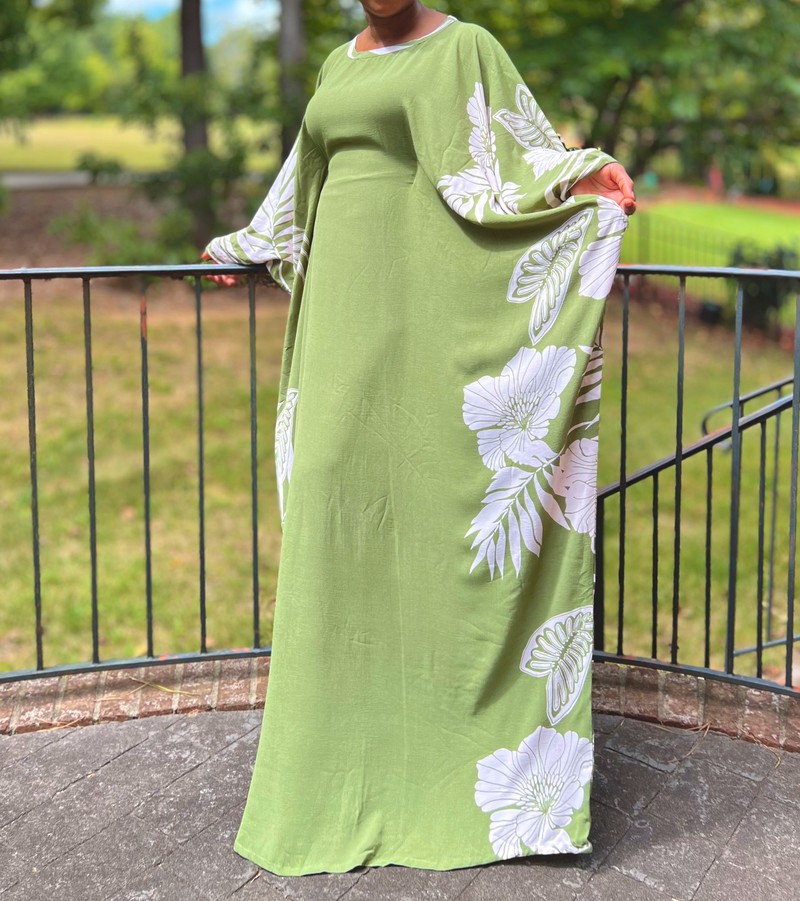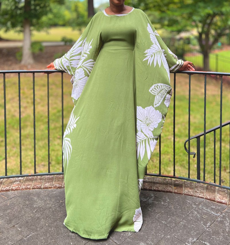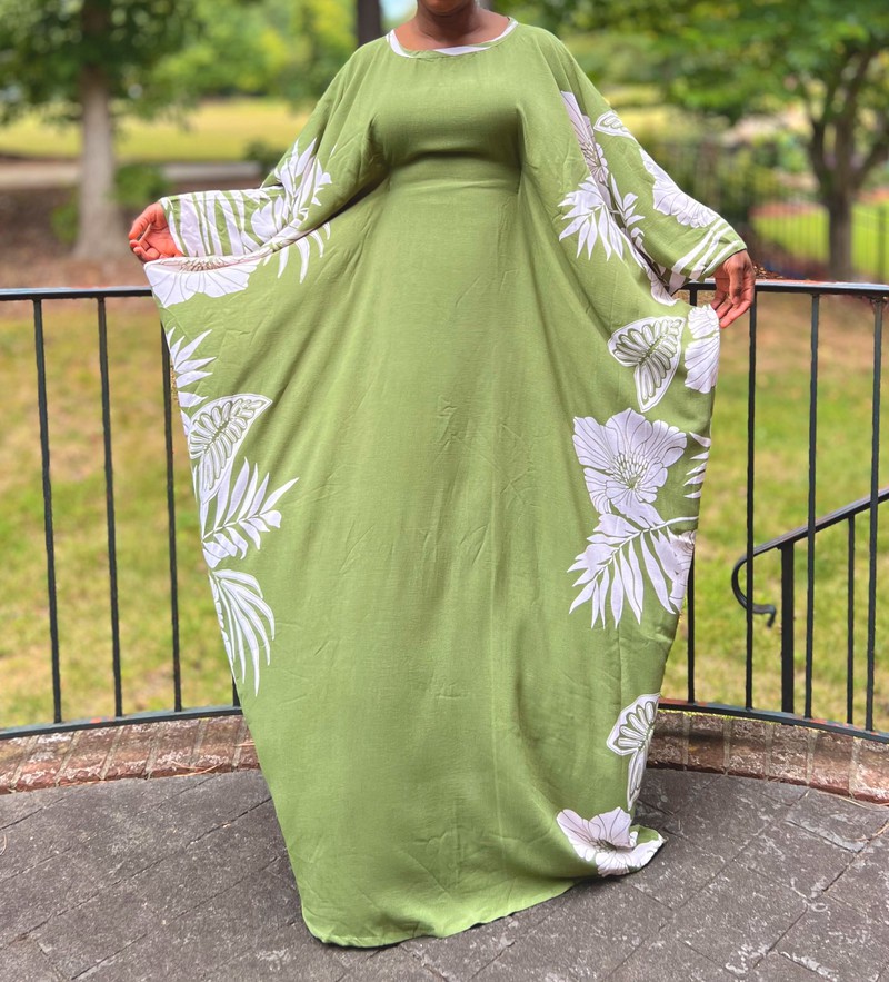 Green Tropical Floral Print oversized Maxi kaftan dress Crepe fabric Great for any occasion