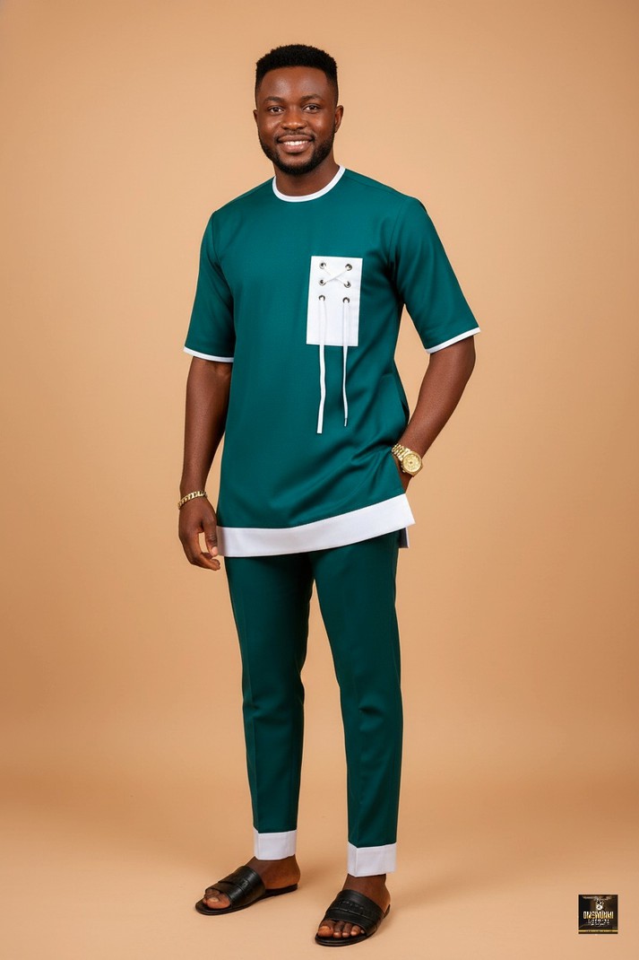 A vibrant, short-sleeved tunic and trouser set in a rich emerald tone. The top is defined by clean white contrast banding around the hem and sleeves. Its most distinctive feature is the geometric white square pocket on the chest, detailed with lace-up eyelets and white drawstring ties. The white detail is mirrored on the trouser cuffs, linking the two pieces harmoniously Ideal for Friday wear, summer parties, graduation events, travel, or relaxed celebratory gatherings, engagement parties, wedding guest attracts, corporate gatherings, or upscale dinner outings. Material: Cotton/wool Color: Green